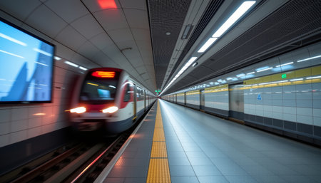 Fast subway train passing through station, creating blurred motion effect, emphasizing speed and urban transit