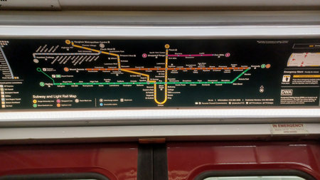 Toronto, ON, Canada - December 6, 2025: The official new route map for the Toronto Transit Commission (TTC) subway and light rail lines is displayed inside a transit vehicle for public viewing.