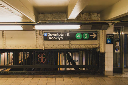 The underground infrastructure of the New York subway in the USA, uncrowded in the early hours of the morning. Brooklyn Bridge - City Hall subway station.