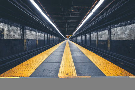 Empty Subway Station Perspective with Bright Yellow Safety Lines and Fluorescent Lighting