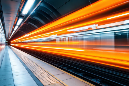A time-lapse image capturing the motion of a train as it speeds through the tunnel, emphasizing the efficiency and speed of subway travel.