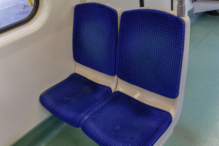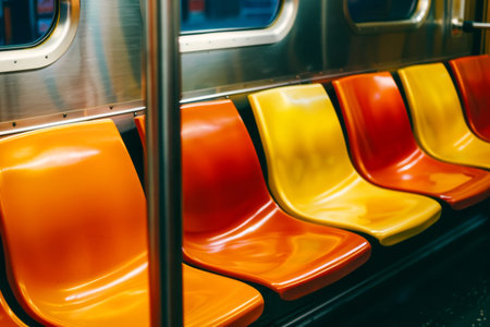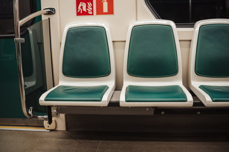 Interior of a subway train with seats and seats, close-up