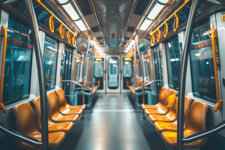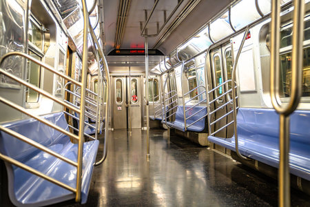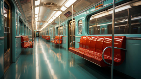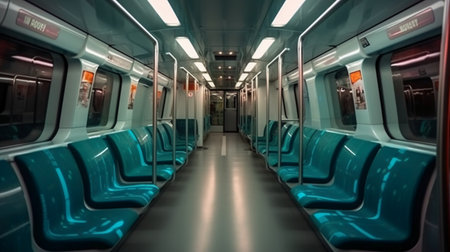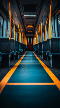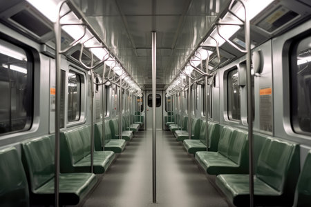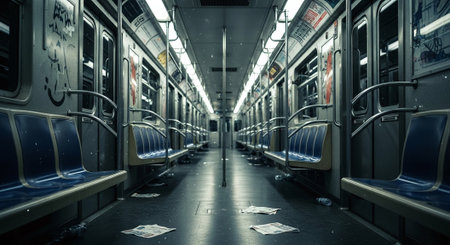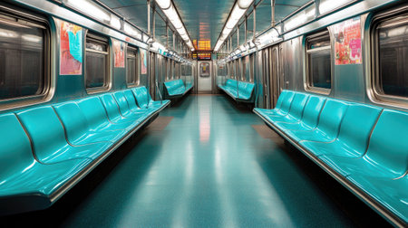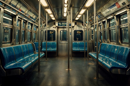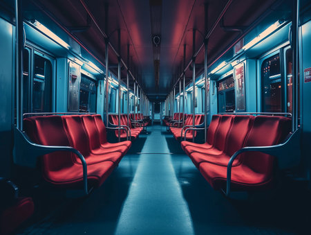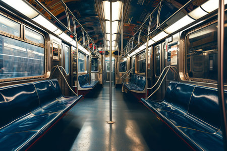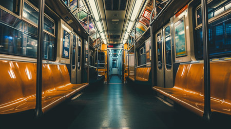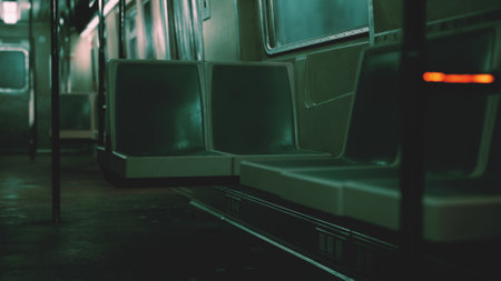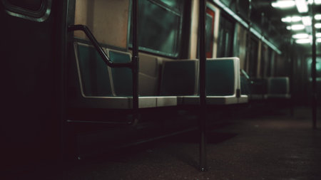 The quiet interior of a subway car highlights vacant seats and dim lighting, capturing the essence of urban solitude during the late night commute in a bustling city.