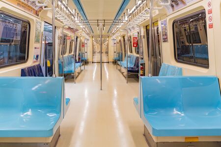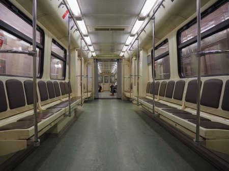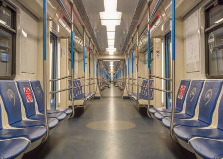 Moscow, Russia June 6, 2020: Metro car inside view. Interior of a passenger metro train, armchairs, perspective. Empty subway car.