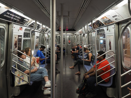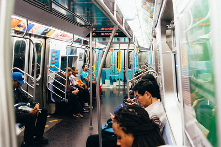 New York, USA - June 1, 2019: The inside of one of the many subway trains that serve New York city.