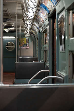 New York City subway train empty wagon view. Public transportation of NYC, United States of America