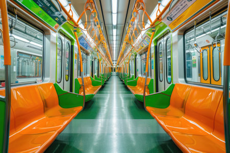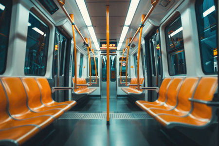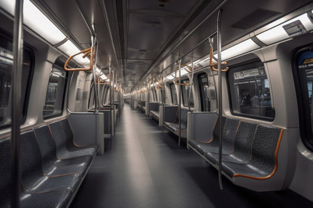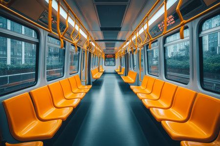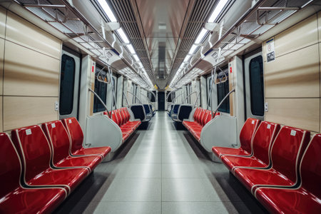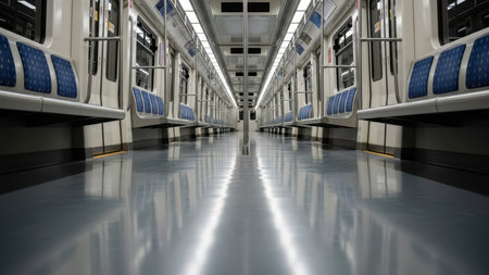 Bright, sleek subway carriage with orderly seating on either side, showcasing a balanced layout and a spacious, illuminated ambiance for commuter comfort.