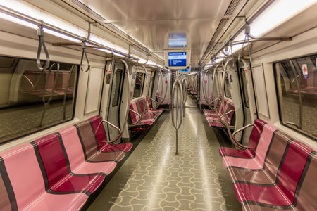 Doha, Qatar- October 29 2020 - Qatar metro compartment interior. seats with social distancing sign due to Covid 19. social distancing