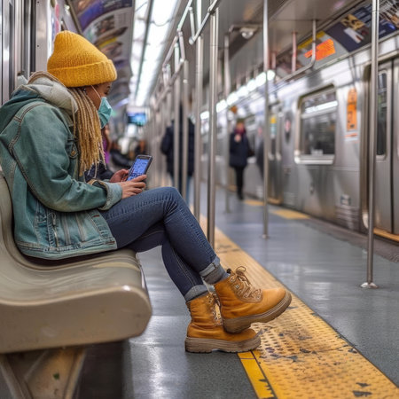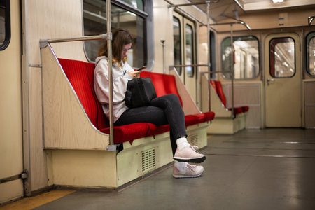 A young woman rides in a modern subway car with a phone in her hands. A beautiful girl in sweater rides after work in the subway with a smartphone in a half-empty car.