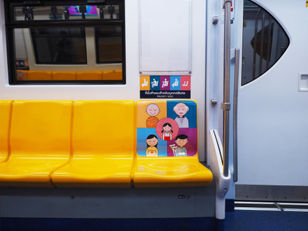 Bangkok, Thailand - January 09, 2020 : Empty yellow seat with colorful graphic cartoon for priority people on BTS Sky train, Bangkok, Thailand.