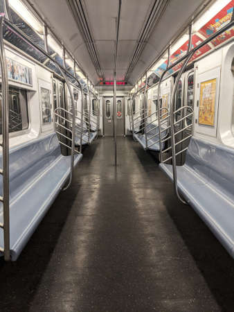 New York, NY - March 12 2021: Empty NY subway train. No people in wagon. NYC subway as one of the oldest public transportation system