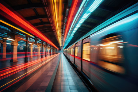 Fast subway train passing through station, creating blurred motion effect, emphasizing speed and urban transit
