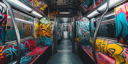 Empty subway carriage artistically vandalized with colorful graffiti tags and designs