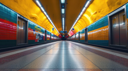 A stunning subway station scene showcasing a vibrant atmosphere with colorful lights and an empty platform, evoking feelings of urban travel and solitude during the night.
