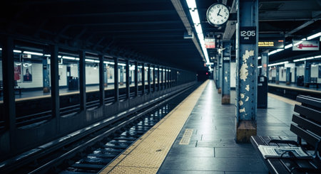 The underground infrastructure of the New York subway in the USA, uncrowded in the early hours of the morning. Brooklyn Bridge - City Hall subway station.