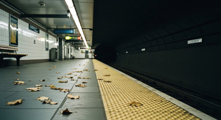 A subway station platform with fallen leaves scattered on the ground, dimly lit with a dark tunnel in the background