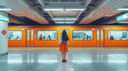Busy train station with orange trains and passengers boarding metro cars. Concept Train Station, Orange Trains, Passengers Boarding, Metro Cars, Busy Atmosphere