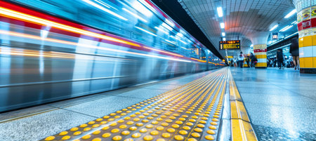 Fast subway train passing through station, creating blurred motion effect, emphasizing speed and urban transit