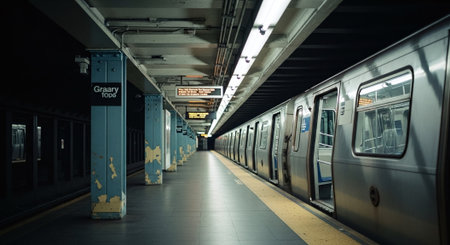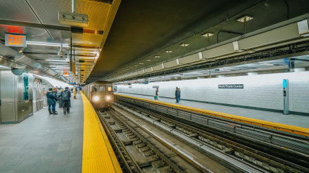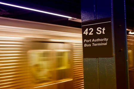 Lifestyle of American people at Times Square subway train station platform. New York city life, underground public transportation, or America culture concept. Banner size
