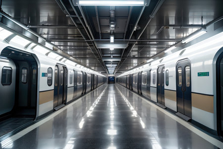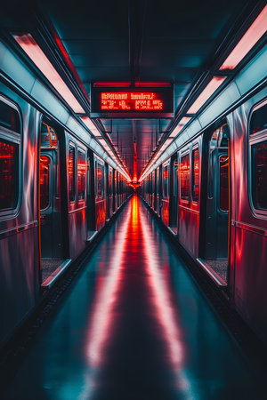 Subway Platform at Night, Glowing Lights and Reflections on Polished Floor, Urban Transportation
