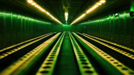 This captivating image features a dimly lit green tunnel, showcasing parallel lines that lead the eye into an abstract urban scene. The illuminated pathway evokes a sense of depth and perspective, creating an intriguing environment.