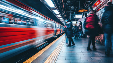 passengers at subway station with blurred train passing, a snapshot of fast-paced city transport.