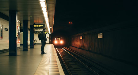 A quiet subway station with a lone figure standing on the platform, dim lighting, empty benches, and a newspaper on the ground