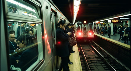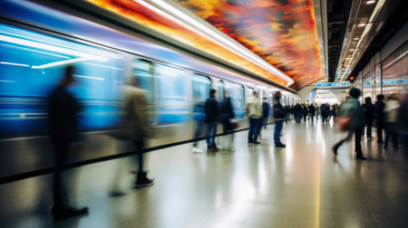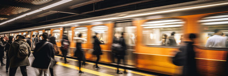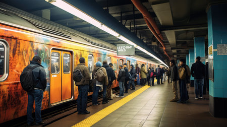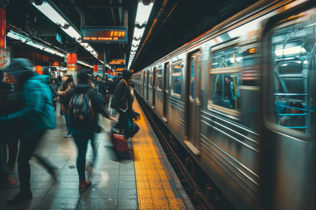 A bustling subway scene with diverse commuters navigating the platform during rush hour. The vivid image captures the dynamics and vibrancy of urban public transportation.