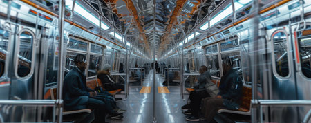 A diverse group of individuals sitting together on a subway train, commuting through a city.