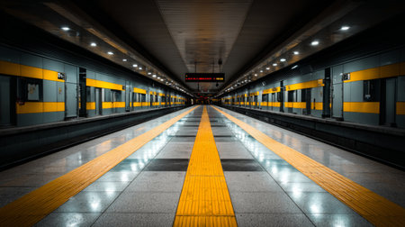 A picturesque view of an urban subway station showcasing clean lines and modern design, featuring an expansive empty platform highlighted by yellow stripes.