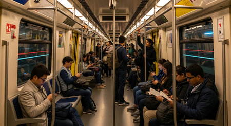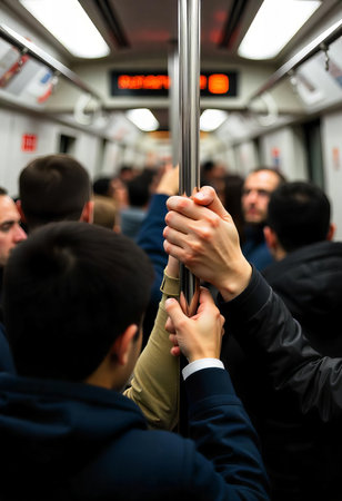 A crowded subway car during peak hours, commuters standing shoulder to shoulder as they travel together