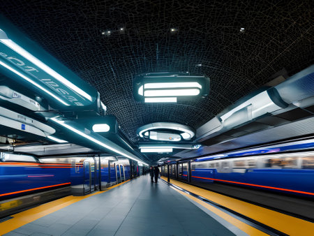 A striking view of an underground railway tunnel showcasing illuminated tracks and modern architecture. The motion blur effect creates a sense of speed and dynamism.
