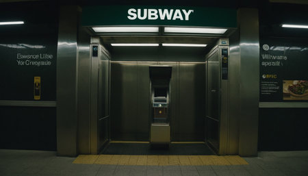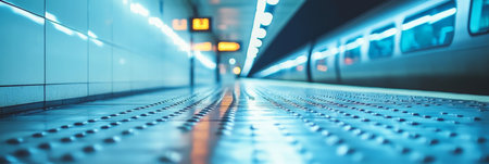 Empty Subway Platform, Blurred Lights, Modern Design, Sleek Industrial Atmosphere, Cool Tones