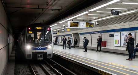 Detailed shot of a subway station with passengers entering and exiting trains, and modern transit signage