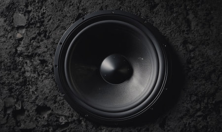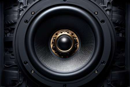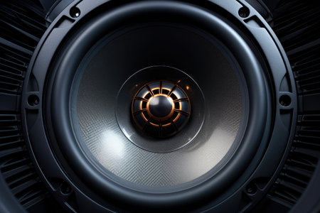 Close-up of a high-quality speaker cone, showcasing the intricate details and engineering of the audio device, emphasizing precision and craftsmanship