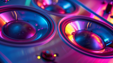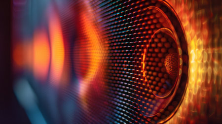 Captivating close-up of a speaker driver showcasing vibrant colors and intricate details, perfect for themes of music, technology, and audio equipment.