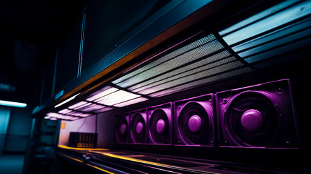 A captivating shot of speakers arranged in a row at a live concert, illuminated by colorful stage lights, capturing the energy and excitement of a performance
