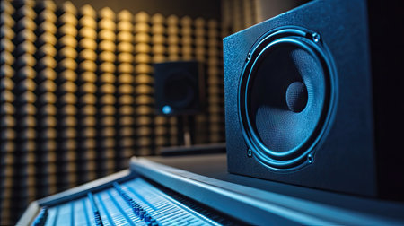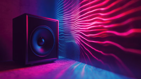 A speaker in a recording studio with sound waves radiating from it, capturing motion and energy.