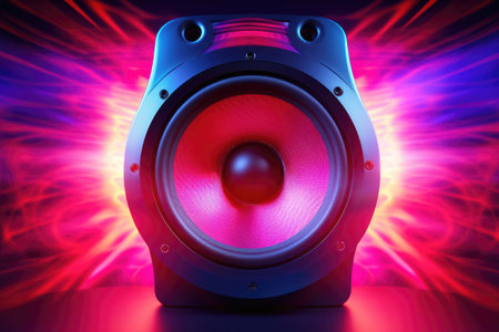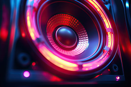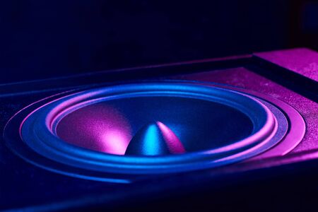 Sound audio speaker with neon lights on dark background. Dynamic monitor closeup. Creative backgroound