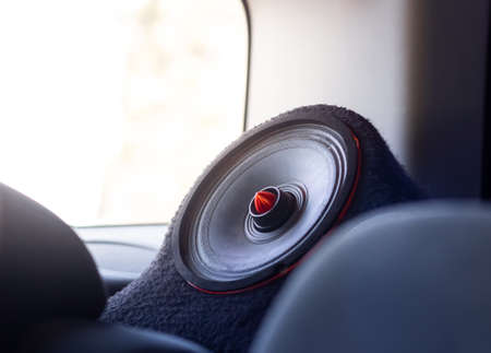 Close-up of black car sound speakers on a black background, with a powerful subwoofer for hard bass.