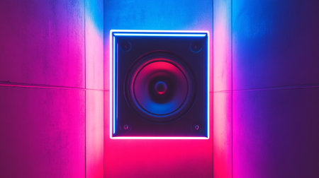 Neon-lit speaker with dynamic monitor. Creative backdrop.