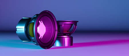 Neon colored stereo speaker on dark background with reflection.Sound audio loud speaker with copy space