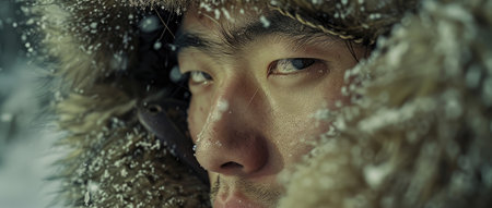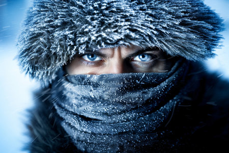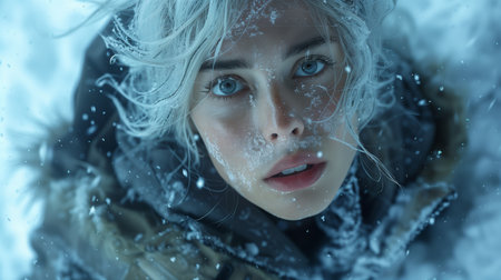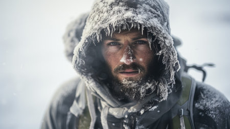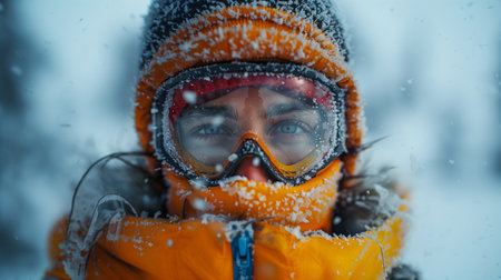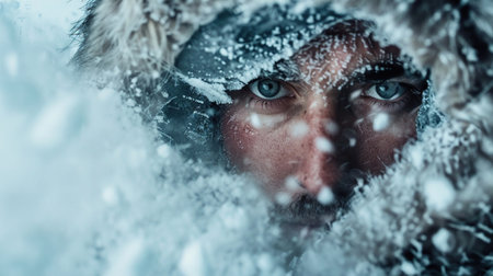 Close-up portrait of explorer with snow-covered face and blue eyes, enduring extreme winter conditions during a blizzard