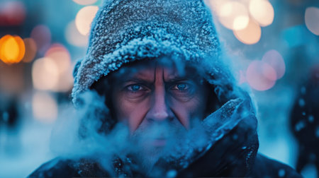 Winters icy grip, a portrait of a frosty man braving the elements in fur hat and frozen clothes.