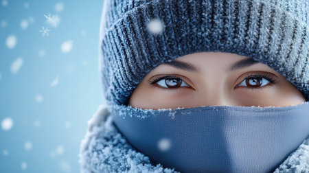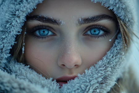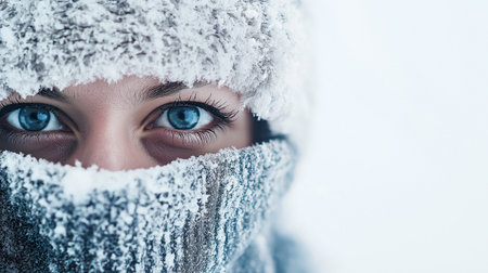 A close-up portrait of a person wrapped in warm winter attire, showcasing icy details and captivating eyes. The image evokes a frosty atmosphere and winter mood.