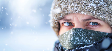 A person shielding their face from a cold wind with a blurred, icy backdrop for text placement. -