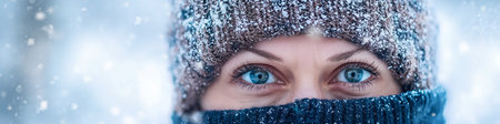Close-up of a woman's face wearing winter clothes, her captivating blue eyes peering out from a snowy landscape
