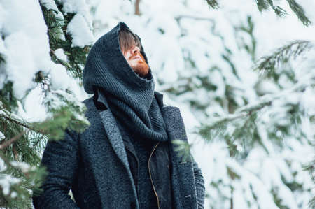 Portrait of a man in the winter forest.
