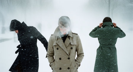 In a picturesque winter setting, a person is warmly dressed, facing the snowfall with resilience and poise.