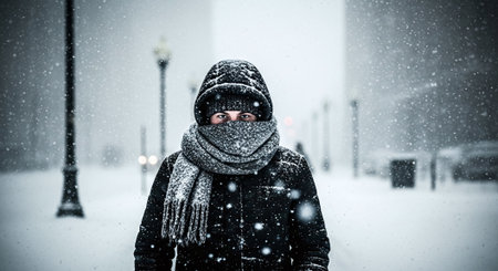 A person bundled up in a warm coat and scarf, standing in a snowstorm.